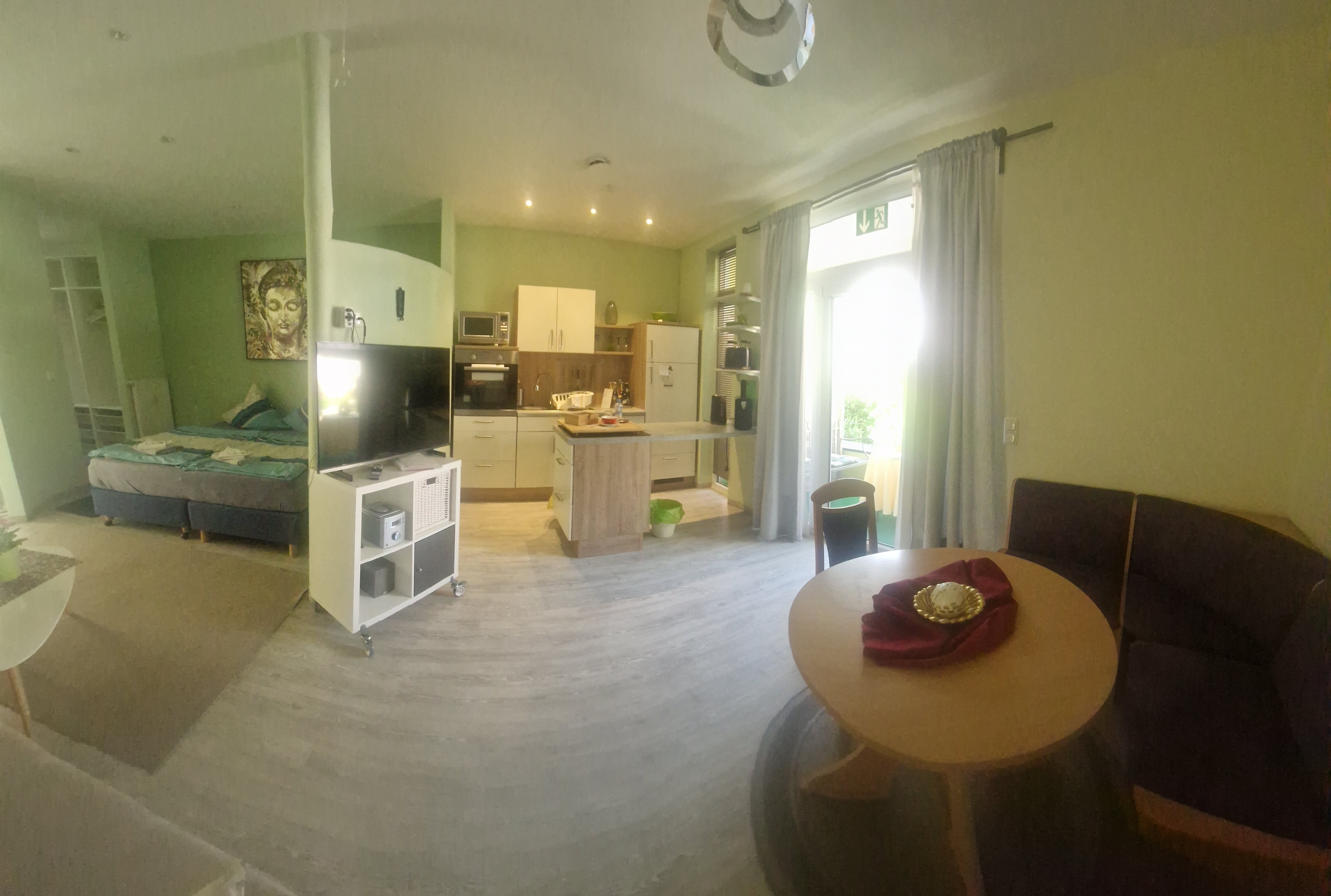 Dieses komfortabel geschnittene Apartment läd zum wohlfühlen und genießen ein. Es bietet großzügig Platz für 1 bis 3 Personen. Vor dem Apartment befindet sich eine Loggia mit Blick und Zugang in den Garten, der gemütlich zum abendlichen Gläschen Bier oder Wein mit Blick in den Sonnenuntergang einläd.